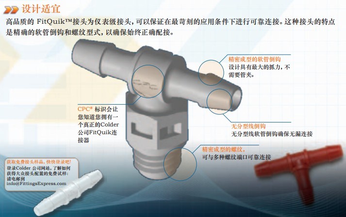 FitQuik® 接头:管道无溢漏连接的高质量接头。这种精密成型的接头设计消除了医疗器械、分析仪器或气动设备中的管道漏点。
